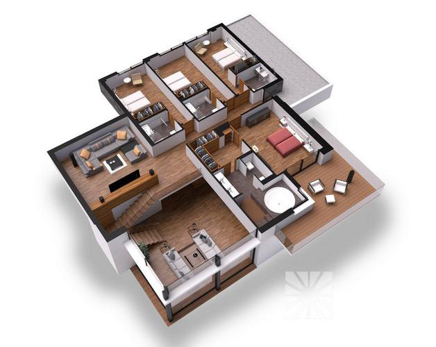 Im Obergeschoss ist besonders das Hauptschlafzimmer von ca. 34 m² hervorzuheben, das eine Ruhezone, einen Ankleidebereich, ein komplett eingerichtetes Bad mit Whirlpool und Dusche einschließt und über eine eigene Terrasse von 41 m² verfügt. Auf diesem Stockwerk finden sich zudem drei weitere Schlafzimmer, jeweils mit Einbauschrank und Bad en suite, sowie ein Wohnzimmer, das als Heimkino-Saal genutzt werden kann.